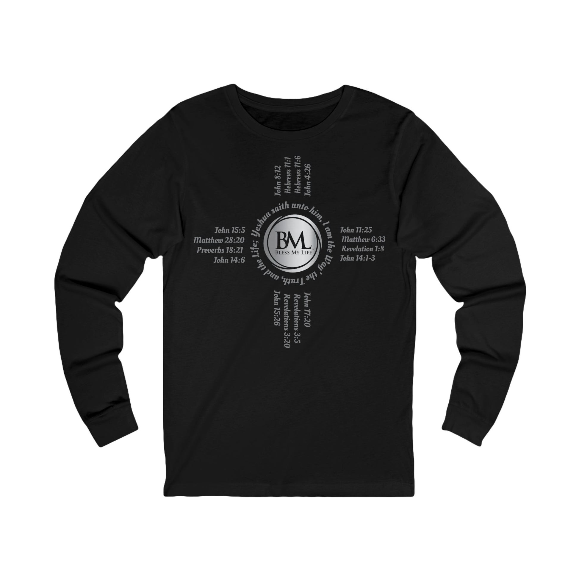 A New Mexican Favorite, Unisex Jersey Long Sleeve Tee with Biblical Scriptures surrounding BML logo and in the form of the famed & respected Zia Pueblo Symbol